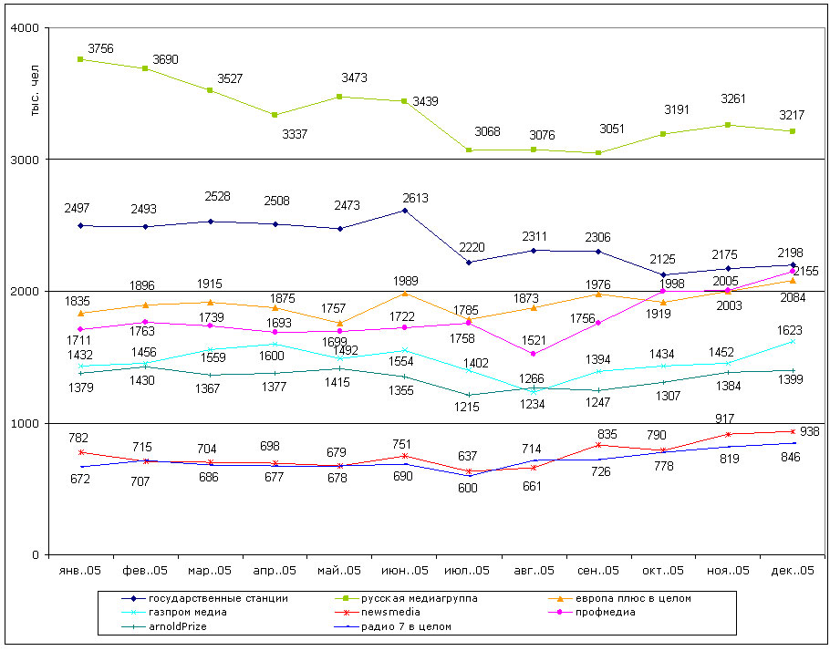 График 4. Динамика ежедневной аудитории крупнейших медиа-холдингов Москвы в 2005 году (тыс. человек).