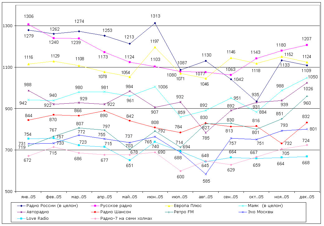 В конце 2005 года радиостанции «Маяк» и «Маяк 24» объединились в единую сеть «Маяк», уверенно обойдя «Авторадио» и вышло на 4 место по Москве. Радиостанция «Ретро FM» (входит в холдинг «Европа плюс») сделала за 2005 год серьезный прорыв с девятого места на шестое, обойдя, таким образом, радио «Шансон», «Эхо Москвы» и «Love Radio». Последнее при этом опустилось с седьмого на десятое место. Причем, практически в течение всего года «Радио 7 на семи холмах» и «Love Radio» шли вровень по объему ежедневных аудиторий, неоднократно обгоняли друг друга, но в конце года «Радио 7» таки обошло «Love Radio»и вышло на девятое место по Москве по объемам ежедневной аудитории. Нельзя также не упомянуть о значимом объединении, состоявшемся уже в начале 2006 года. Холдинг «Европа плюс», в состав которого входят две радиостанции «Европа плюс» и «Ретро FM» приобрел другой холдинг «Радио 7», включающий три радиостанции («Радио 7», «Мелодия» и петербургское «Эльдорадио»).