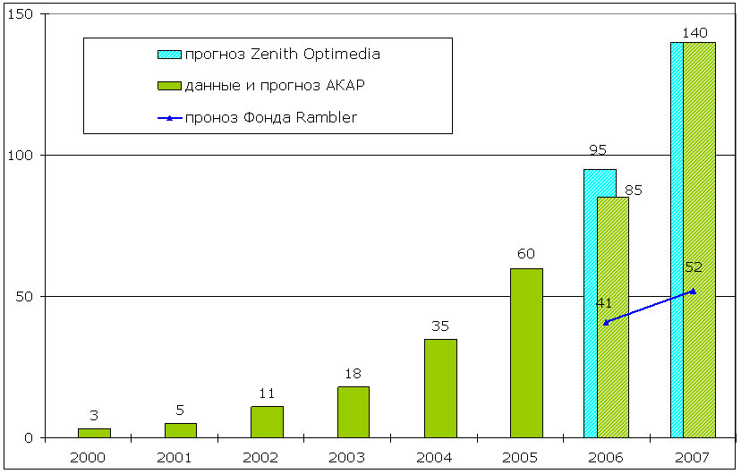 Рынок Интернет-рекламы на сегодняшний день является самым быстрорастущим сегментом рынка рекламы, как в России, так и в мире. В 2005 году в России объемы затрат на Интернет-рекламу выросли на 71,4%, по прогнозу АКАР в 2006 году темпы прироста составят 70%. Однако пока рынок Интернет-рекламы составляет только 1,2% объема рекламного рынка в 2005 году или $60 млн. Согласно прогнозам АКАР за 2006 год рынок Интернет – рекламы заработает $85 млн. (или доля в 1,4%), показав прирост 70%.