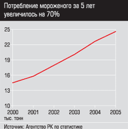 Казахстанский же рынок мороженого растет с динамикой 12,5% в год. По мнению бренд-менеджера компании Nestle Александра Ли, он увеличивается за счет того, что происходит отток потребителей в более высокий по цене сегмент, а не за счет увеличения объемов потребления. Однако до уровня 90−х годов нам еще далеко, тогда страна производила 34 тыс. тонн мороженого. По статистическим данным, в 2005 году Казахстан потребил 25 тыс. тонн, из них 50% составила импортная продукция. Таким образом, объемы местного производства составляют 12–13 тыс. тонн.