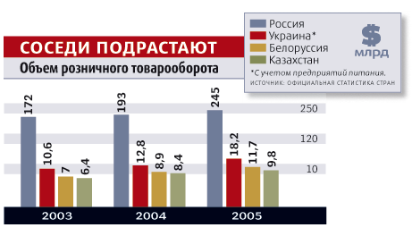 Согласно официальной статистике, в 2005 г. объем розничной торговли на Украине достиг $18,2 млрд, в Белоруссии — $11,7 млрд, Казахстане — $9,8 млрд. Это немного. Российские ритейлеры в прошлом году в одной только Москве наторговали на $45 млрд.