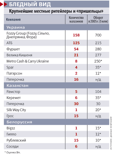 В 2004 г., когда “Патэрсон” с “Перекрестком” только готовились к завоеванию Украины, местная цивилизованная розница не казалась серьезной силой. Финансовые показатели пяти крупнейших ритейлеров отличались от показателей российских пришельцев в разы. Оборот Fozzy Group (владеет сетями супермаркетов “Сiльпо” и “Днепрянка”, дискаунтерами “Фора” и магазинами cash & carry Fozzy) едва дотягивал до $290 млн, оборот сети “Фуршет” составлял $240 млн. Выручка оператора сети гипермаркетов “Велика Кишеня” компании “Квиза-Трейд” достигла $134 млн. Днепропетровская “АТБ-маркет”, владеющая сетями дискаунтеров АТБ, заработала $160 млн. Украинское подразделение Мetro Group — Metro Cash & Carry Ukraine — около $150 млн.