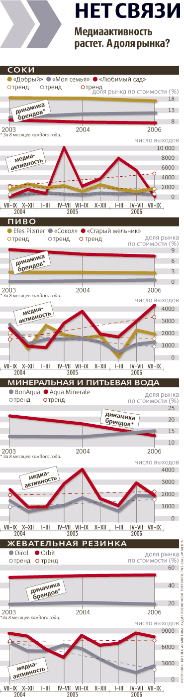 Неплохо росли продажи соков Моя семья, при том что медиаактивность их производителя оставалась на одном уровне. Я считаю рекламный сериал "Моей семьи" удачным примером креативного решения не в ущерб продвижению самого бренда, доволен директор департамента рекламы и маркетинга компании Нидан Соки Аркадий Курин. BAAR-индекс роликов Моей семьи положителен. Рыночная доля соков Любимый сад падает, хотя Вимм-Билль-Данн рекламирует их все больше. Ролики самого узнаваемого сокового бренда Добрый и воспринимаются положительно, и показывают их регулярно. А вот доля рынка Доброго упала.