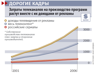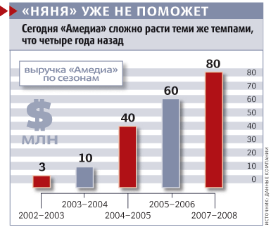 Рынок телесериалов, которые так хорошо умеет снимать Амедиа, уже не может обеспечить быстрого роста бизнеса. В прошлом году телеканалы закупили сериалов на $300 млн. Однако премьер в этом жанре будет немного. По прогнозам Амедиа, доля премьерных показов с нынешних 30% упадет до 22-25% в общем объеме сериального вещания. Каналы будут все чаще показывать передачи прошлых лет из собственных библиотек. Производство становится все дороже из-за растущих зарплат актеров, операторов, режиссеров и сценаристов. Продукт Амедиа и так стоит дороже, чем у конкурентов. Но теперь цены вряд ли удастся поднимать быстрее чем на 10-15% в год: у пионера сериальной индустрии сегодня много конкурентов. На 2007/08 г. Амедиа запланировала рост уже не на 50%, как в прошлый сезон, а на 30%. У компании слишком высокие затраты. Сейчас мы расходуем $0,80-0,85 на каждый доллар оборота. Должны выйти на $0,75, рассказывает Мишин.