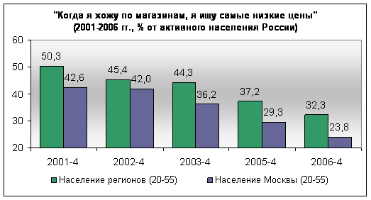 Однако, массовый рынок все еще внимательно смотрит на ценники. Понятно, что рост доходов и общий благоприятный экономический фон дают все основания для оптимизма. Растет доля состоятельной публики, обращающей все больше внимание на качество и торговую марку, удобство и социальную значимость владения продуктом. Тем не менее, как показывают исследования, цены остаются важным фактором выбора торговой точки для каждого второго жителя Москвы старше 16 лет. А в регионах этот процент еще выше.