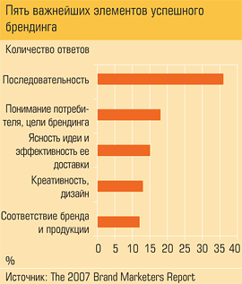 Отвечая на вопрос: «Какие, на ваш взгляд, аспекты брендинга являются наиболее критическими для его успеха?», участники опроса поставили на первое место (36% респондентов) последовательность. На втором месте, набрав в два раза меньше голосов, оказалось понимание потребителя / понимание цели брендинга. Идея, которую компания пытается донести до потребителя с помощью бренда, должна быть четко сформулирована и эффективно доставлена – это положение почти с 15% замыкает тройку ключевых стратегий успешного брендинга.