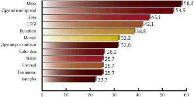 | ПРЕДПОЧИТАЕМЫЕ МАРКИ ОДЕЖДЫ, ДОЛЯ ОПРОШЕННЫХ, % |