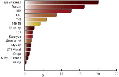 | САМЫЕ ПОПУЛЯРНЫЕ У «БЕЛЫХ ВОРОТНИЧКОВ» ТЕЛЕКАНАЛЫ, % |