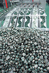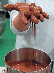 Брикеты полуфабриката закидывают в котлы, добавляют сахар, сухое молоко, лецитин и прочие ингредиенты, а потом человек к шоколаду не прикасается вовсе. Роботы добавляют в застывшую шоколадную чашечку начинку и прикрывают ее шоколадным донышком, они же выбивают конфеты из формы молоточками и присосками раскладывают их по коробкам.