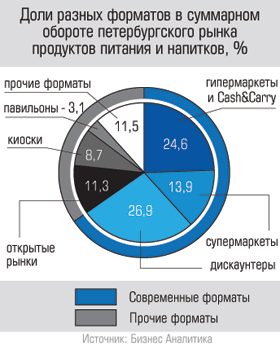 Так называемая организованная розница уверенно забирает покупателей у независимых магазинов и открытых рынков, и в этом смысле Петербург мало отличается от других регионов России. Однако по темпам развития крупного ритейла город на Неве является абсолютным лидером. Если главным показателем развитости рынка считать большой удельный вес сетевой торговли, то петербургская розница заметно опережает не только другие регионы России, но и некоторые страны Восточной Европы. Отраслевые эксперты и сами ритейлеры подтверждают, что на долю сетей в Петербурге приходится около 45% рынка. (Для сравнения: в Москве, по данным РБК, через сети реализуется не больше 25% продуктов питания.) По прогнозам, в ближайшие полтора-два года доля сетей в Петербурге может вырасти до 60%.