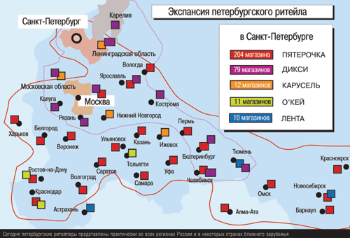 Несмотря на приход иногородних ритейлеров, уже в начале 2000−х годов в Петербурге сформировалась группа местных игроков, которые занимают доминирующие позиции на рынке. Эти компании стали присматриваться к другим регионам. Примечательно, что некоторые из них изначально создавались с прицелом на федеральную экспансию. Розничный бизнес «Дикси», например, фактически начал развиваться с Москвы, где в 1999 году был открыт первый магазин сети.