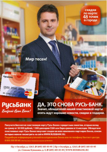 Русьбанк. Обладатель карты - яркий представитель офисных работников. Соответствует ли рекламная персона корпоративной, офисной культуре? Безусловно. Имеется корректный имидж банка, который будет восприниматься потребителем как организация для офисных профессионалов. Другое дело, что этот имидж не оригинален, и слишком большое количество банков ориентированы на бизнес-среду. Но при желании его можно скорректировать. А на фоне всеобщей невнятности, и то, что есть – уже хорошо.