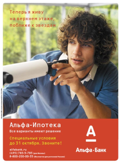 В банковской рекламе, как и в любой другой, креатив не принципиален. Это обертка рекламного сообщения. А само сообщение, на основании вышеозначенных тезисов, должно доносить этот самый имидж – ориентацию банка на определенную социальную группу, выделенную по признаку общей культуры. А не словесный мусор в духе «эта линия символизирует устремленность в будущее». Самый простой способ показать то, на какую культурную среду нацелен банк, каков его имидж – показать портрет потребителя. А человек уже на основании этого составит достаточно устойчивое представление. Хотя возможны и другие варианты. Конкретный мессидж в отношение рекламного продукта, также можно признать неважным – все продукты всех банков плюс-минус одинаковы для потребителя. И он, этот потребитель, совсем не так глуп, чтобы выбрать банк лишь на основании того, что ему вместо слова «ипотека» сказали «твой будущий дом». Да и не будет потребитель вчитываться в эти слоганы, у него нет на это ни времени ни желания. Человек воспринимает рекламу очень поверхностно. Он воспринимает образы. А человеческие образы - наиболее хорошо. Итак, попробуем с этой позиции проанализировать некоторые примеры банковской рекламы.