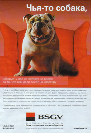 Банк Сосьете Женераль Восток. Бесспорно, это реклама имиджевая. Но какой имидж? Использование собаки там, где должны быть люди - оно конечно очень необычно. Внимание должно привлечь. Но к чему нужно привлекать внимание? К странному утверждению, что желание временно нянчиться с чужой собакой – мотив для покупки квартиры? С сегодняшними суммами и процентами по кредиту? Банк ориентирован только на любителей собак? Притом чужих собак? А что делать любителям кошек? Сосьете Женераль уже не для них? И как связаны собаки и банковские услуги? По меньшей мере странный и неразумный шаг уважаемой иностранной банковской структуры. Впрочем, это не удивляет – описываемые правила не понимают и за рубежом.
