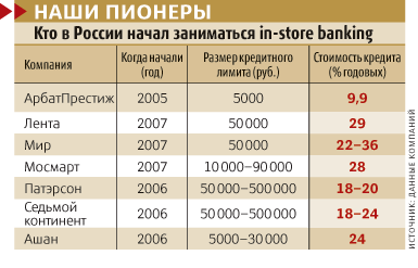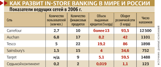 Для получения кредита в Седьмом континенте достаточно предъявить паспорт плюс что-то одно из трех: водительские права, военный билет или загранпаспорт. Чем больше документов, тем ниже процентная ставка, уверяет Георгий Шабад, советник председателя правления банка Финсервис. Банк был создан в мае 2006 г. Седьмым континентом и Собинбанком (которые выкупили соответственно 51 и 49% КБ Комплекс) для обслуживания потребкредитов, выданных в магазинах ритейлера. Так же действует, к примеру, британская Tesco: финансовые услуги покупателям сети предоставляет банк Tesco Personal Finance, образованный на паритетных началах с Royal Bank of Scotland Group. На своих рынках полностью подконтрольные банковские дочки есть у французской Auchan, американской Target, британской Sainsbury's. Открывая магазины за границей, сети, как правило, находят партнера из местных: скажем, в Турции Carrefour finance работает с Finansbank.