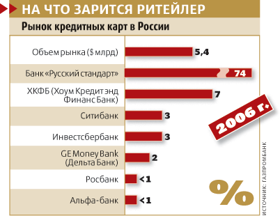 Первая попытка создать платежную карту под брендом супермаркета была предпринята восемь лет назад Седьмым континентом и МДМ-банком. Серьезных результатов она не дала, и в прошлом году сеть взялась развивать новую программу с банком Финсервис. Банк Русский стандарт второй год выпускает карты для московских магазинов АрбатПрестиж. Патэрсон уже год предлагает свои карты, которые выпускает ВТБ 24. В этом году собственные кредитки начали предлагать Мир (партнер Русский стандарт), Мосмарт (GE Money Bank) и Лента (Инвестсбербанк). Руководитель проекта X5 Retail Group Марк Шрайбер изучает варианты продвижения финансовых услуг в сетях Перекресток и Пятерочка. До конца 2007 г. должна определиться с банком и Евросеть.
