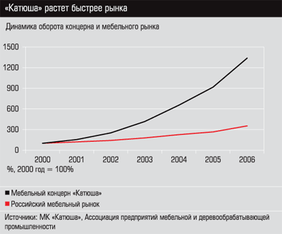 Прорыв «Катюши» на рынок мебели был стремительным: всего за какие-то пять лет она превратилась из полного банкрота в отраслевого лидера. Сегодня концерну принадлежит 4% отечественного рынка корпусной мебели (это крупная доля, учитывая его чрезвычайную раздробленность). По этому показателю «Катюша» сегодня уступает только «Шатуре» (8,4% рынка) и производителям дешевой массовой мебели — российско-польской «Столплит» (4,7% рынка) и изготовителю кухонной мебели компании «Электрогорскмебель» (4,8%). Сегодня у «Катюши» одна из самых больших в России розничных мебельных сетей, в состав которой входят 400 магазинов. Компания растет намного быстрее рынка — за 2006 год ее обороты увеличились более чем на 40%, в то время как темпы роста рынка корпусной мебели составили около 23%. Если эта динамика сохранится и в дальнейшем, «Катюша» через три года сможет занять 10% рынка — такой доли еще не было ни у одного из отечественных игроков.