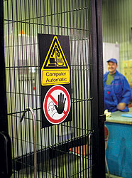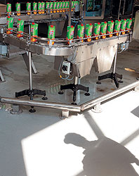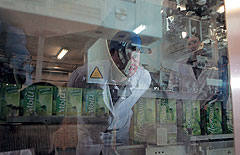 | | Наблюдать за процессом упаковки, как и за любым другим этапом производства соков, можно только из-за стекла | Кроме того, современные технологии позволяют максимально сохранить уже имеющиеся во фруктах натуральные полезные вещества. С точки зрения экономичности производства это выгоднее, чем синтезировать или закупать искусственные премиксы. Например, "Нидан Соки" в качестве ингредиента, содержащего аскорбиновую кислоту, добавляет в свои соки барбадосскую вишню, ацеролу -- даже при термической обработке она не теряет содержания аскорбинки.