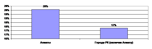 В соответствии с этой классификацией к среднему классу в Казахстане можно отнести около 17% взрослого городского населения (Рисунок 1). В Алматы доля населения, относящегося к среднему классу, незначительно выше, - около 20%.