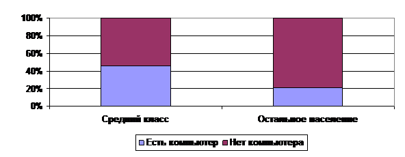 Значимо различается и оснащенность компьютерами в семьях, представители которых относятся к среднему классу, и среди остального населения (Рисунок 3). В семьях среднего класса компьютер есть практически у каждой второй семьи (46%), среди остального населения компьютер имеет лишь каждая пятая семья (21%).