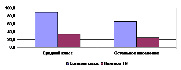 Похожая ситуация наблюдается и с использованием таких телекоммуникационных услуг, как сотовая связь и платное телевидение (Рисунок 4). Доля пользователей этими услугами значимо выше в семьях представителей среднего класса, где сотовой связью пользуются 9 семей из 10, услугами платного телевидения - каждая третья семья