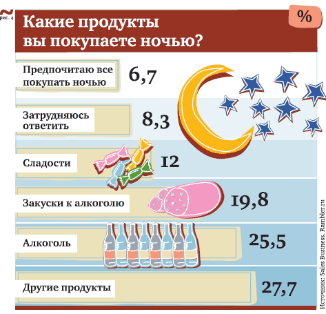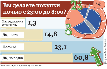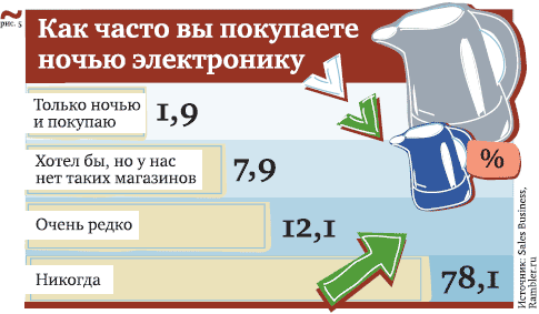 Число «бессонных» торговцев несъедобным ассортиментом растет также быстро. Даже слишком, если учесть, что спрос на непродовольственные товары изначально очень ограничен. Так, почти 79% участников опроса заявили, что никогда не делали подобных покупок ночью.
