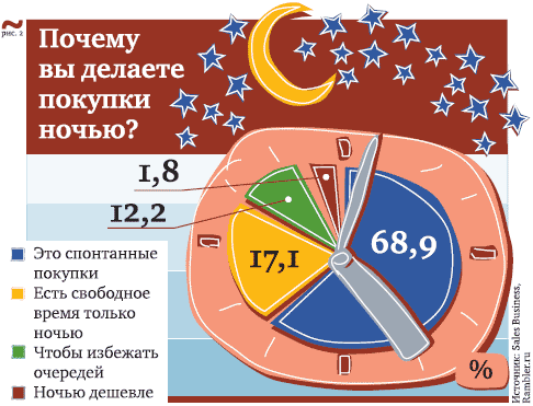 Но бурного подъема потребительской активности в темное время суток эксперты не наблюдают. «Темпы роста розницы в последние годы обусловлены только повышением среднего уровня цен. Поток посетителей ночью остается стабильным. Правда, в период с 23:00 по 24:00 число покупателей, по нашим данным, выросло на 15–20%. Это связано с изменением образа жизни горожан, в частности, для многих сдвигается время окончания рабочего дня», – высказывается Сергей Фильченков, аналитик ИК «ФИНАМ».