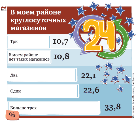 Свыше 33% участников опроса, проведенного журналом Sales Business и интернет-порталом Rambler.ru (в голосовании приняли участие 23 307 человек), отметили, что в их районе сегодня нон-стоп работает больше трех магазинов. Еще 22% опрошенных заявили, что имеют поблизости как минимум две торговые точки, где можно сделать покупки в темное время суток. Наряду с этим 61% респондентов утверждают: шопинг с 23:00 до 8:00 для них редкость. Еще 23% опрошенных и вовсе никогда не затовариваются в эти часы. Значит, ритейлерам приходится делить между собой оставшиеся 14,5% активных посетителей, которые, согласно опросу, частые гости ночных магазинов. Эксперты затрудняются назвать точные цифры роста количества круглосуточных точек, так как централизованной статистики по рынку нет. Однако свидетельствуют: если раньше режим «24/7» был весомым конкурентным преимуществом, то сегодня для продуктовой розницы это норма. Причем не только для крупных сетевых ритейлеров, но и для многих мелких игроков.