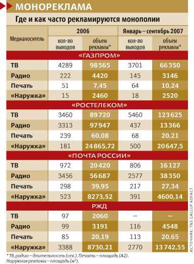 Размер своего рекламного бюджета в «Газпроме» не раскрывают. Хотя в прошлом году в прессу все же просочились сведения о годовых имиджевых затратах монополии $82 млн на рекламу, спонсорство и благотворительность. Цифры за этот год неизвестны, но, по-видимому, они будут ненамного скромнее. По данным TNS Gallup AdFact, суммарное количество выходов рекламы «Газпрома» за три квартала 2007 г. уже составило 85% от прошлогоднего размаха. Еще три года назад министр по чрезвычайным ситуациям Сергей Шойгу подсчитал: денег, которые «Газпром» вкладывает в телерекламу, МЧС хватило бы для закупки двух самолетов. С тех пор прошло много времени впору вести речь о целой эскадрилье.