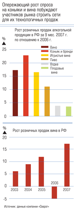 Растущий интерес алкогольных дистрибуторов к созданию специализированных винных магазинов объективно оправдан. По свидетельству участников рынка, импорт алкоголя становится все менее маржинальным бизнесом. Прибыльность его снижается, с одной стороны, вследствие высоких политических рисков (как продемонстрировал 2006 год, непредсказуемые решения властей могут надолго парализовать бизнес). С другой стороны, дистрибуторы испытывают все большее давление со стороны торговых сетей, диктат которых повышается с каждым годом. Особенно актуальна эта проблема для поставщиков, работающих на рынке Санкт-Петербурга, где в 2007 году, по разным оценкам, уровень консолидации розничной торговли составил 70?80%.