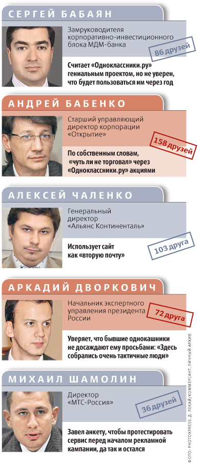 Это как наркотик. Среди завсегдатаев «Одноклассников» можно найти даже крупных бизнесменов и чиновников, чье время расписано по минутам. Для генерального директора «Альянс Континенталь» Алексея Чаленко «Одноклассники» стали «второй почтой», с помощью которой он регулярно обменивается новостями с друзьями и деловыми партнерами. Старший управляющий директор «Открытия» Андрей Бабенко порой использует «Одноклассников» как средство для деловых переговоров.