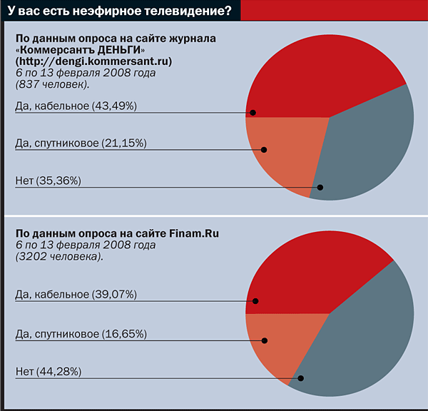 Иная позиция у Михаила Силина, вице-президента Ассоциации кабельного телевидения России, вице-президента компании "Ренова-Медиа": Вот, например, возьмем ту же самую пожилую аудиторию. Простой вопрос: будут ли пожилые люди смотреть канал о том, как сохранить свое здоровье? Или, например, телеканал со старыми фильмами, которые они любят? Разумеется, будут. Другое дело, что у общедоступного телевидения в России сегодня действительно сильные позиции. В мире немного стран, где общедоступные каналы транслируют такой богатый ассортимент телепрограмм, включая относительно свежие голливудские фильмы и спорт, то есть то, что во всем мире традиционно сначала попадает в кабель. Но перераспределение интереса здесь всего лишь дело времени, нишевой интерес -- явление объективное. Скажем, вы любите "К барьеру" Владимира Соловьева по НТВ, и только его по НТВ и смотрите. А представьте, что появился канал с целой линейкой подобных телешоу, половину из которых будет вести лично Соловьев. Неужто устоите? По моим оценкам, уже через пару лет доля общего телесмотрения неэфирных каналов составит около 40% всего времени, которое аудитория будет тратить на ТВ.
