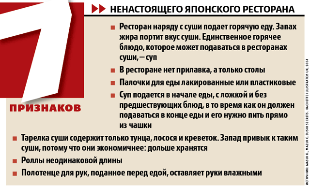 Большинство российских ресторанов нарушает традиционную японскую технологию. Михаил Степанников водил не одну японскую делегацию по московским суши-барам. Что в них не так, с точки зрения японца? «Рис не тот, не клейкий, не тех сортов. Неправильный васаби. Суп мисо не настоящий, а из пакетика. При этом цены значительно выше, чем в Японии за такое качество», перечисляет Степанников. Повара буряты или корейцы. Для японца чужеземный повар в японском ресторане, да еще без десятилетнего опыта, дикость. Кроме того, интерьер японских ресторанов в России излишне пафосный. «Ручейки, бамбук, фонари все это скорее характерно для китайского стиля, говорит Степанников. В настоящих японских ресторанах интерьеры аскетичные, там главное еда».