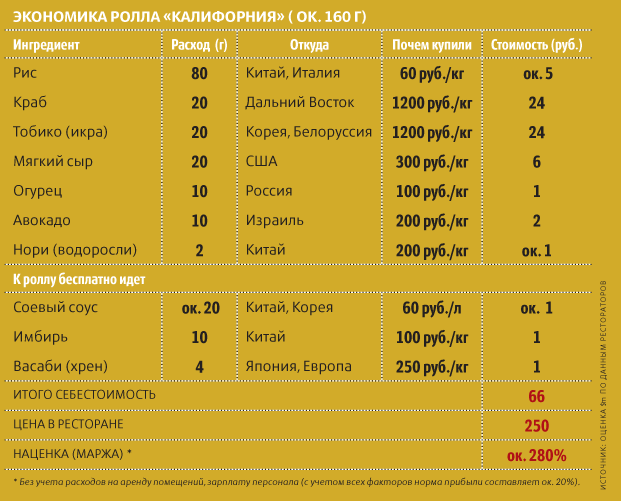 В прошлом году и Япония наконец ввела единый ветеринарный сертификат с Россией. Но на деле ингредиенты для суши закупаются по всему миру там, где дешевле. Имбирь и нори все берут в Китае. Краб, гребешок, красная икра это обычно российское. Саке и паста для васаби из Японии. Гендиректор «Джапан Фуд» (другого оптового поставщика) Андрей Шпунт говорит, что многое зависит от регуляторов: «Раньше мы рис закупали в США, лучшим для суши считается калифорнийский рис нишики. Но потом ввоз его в Россию был запрещен: якобы он генно-модифицированный. Мы переключились на китайский рис». Сушеную тобико везут из Тайваня и Кореи, а затем она обрабатывается в Белоруссии. В свободной экономической зоне в Бресте ее размачивают и окрашивают.