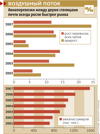 Так что авиакомпании, отправляющие полные пассажиров самолеты из одной столицы в другую 34 раза в день, весьма уютно устроились. «Тут комбинация многих факторов. Некогда монопольный рынок стал доступен практически для любых авиакомпаний, рассуждает гендиректор консалтингового агентства Infomost Борис Рыбак. Усиление роли Северной столицы после избрания президентом петербуржца, а также перенос головных офисов ряда компаний из Москвы на берега Невы непременно должны были спровоцировать одновременный рост спроса и предложения на перевозки». Так и произошло: с 2001 по 2007 г. поток авиапассажиров на этом направлении увеличился вдвое с примерно 700 000 человек в год до 1,5 млн. Вряд ли кого удивит тот факт, что наиболее интенсивный прирост авиаперевозок наблюдался в предвыборные годы.