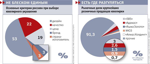 Сколько игроков на ювелирном рынке, столько и разных подходов к торговле. У крупнейшей ювелирной сети «585» (430 магазинов, средний чек 2500-3000 руб.) нет собственного производства. Ее маркетинговые кампании крайне агрессивны («Два по цене одного»). Бежевые стены, песочного цвета оборудование, красная выкладка и команды промоутеров на улице. «Мы пытаемся разрушить стереотипы: используем опыт продавцов бытовой техники и электроники, продуктовой розницы, объясняет руководитель группы развития сети Александр Тарасов. И покупатели готовы это воспринимать».