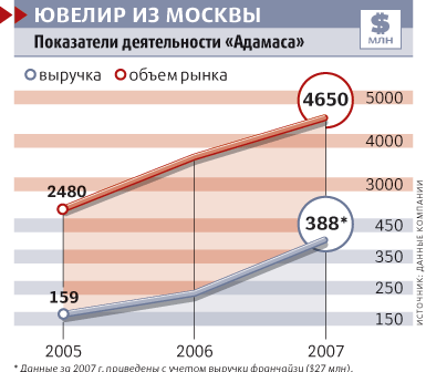 Но игра стоит свеч. Отечественный ювелирный рынок, который оценивается в $4,7 млрд в год, пока еще совершенно дикий. О консолидации, которая вовсю бушует в прочих розничных сегментах, здесь пока и не слыхивали. В прошлом году выручка «Адамаса» достигла $361 млн (с учетом продаж франчайзи $388 млн), включая опт и розницу. По данным агентства Step-by-Step, в 2006 г. (более поздних оценок нет) «Адамас» произвел примерно 14% всех российских украшений из золота. Ближайший конкурент красноярский завод «Красцветмет» довольствовался долей в 5%. В рознице же преимущества «Адамаса» перед конкурентами не столь значительны. По собственной оценке, «Адамас» является вторым по величине продавцом ювелирки в стране с долей 2,6%. Рыночная доля лидера компании «585» около 3%.