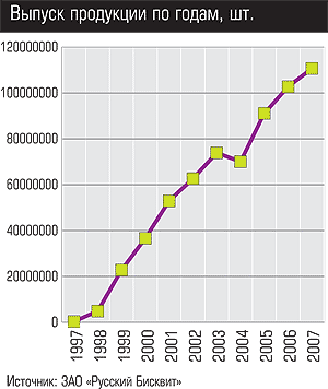 К примеру, первый продукт компании – 300?граммовые рулеты. Спрос на них достиг своего пика в 2002 году (36 млн единиц в год) и объемы продаж стали снижаться. Однако в 2000 году начался выпуск кексов, максимальный уровень их производства пришелся на 2003 год (16 млн единиц), и это позволило не только сохранить, но и увеличить общий объем продукции «Русского Бисквита». Затем в 2001 году было запущено производство вафельных тортов, которое устойчиво росло до 2006 года. В том же году были выведены на рынок мини-кексы, спрос на которые до сих пор демонстрирует подъем. В 2003 году появились мини-рулеты, выпуск которых уже в течение трех лет остается на высоком уровне (около 20 млн единиц). В общем объеме производства небольшой спад случился в 2004 году (с 74 до 70 млн единиц). Виной тому, по мнению Матюшева, опоздание на полгода или даже на год с выпуском очередного продукта – 175?граммового рулета. Впрочем, уже на следующий год новые продукты позволили отыграть более 20 млн единиц кондитерских изделий.