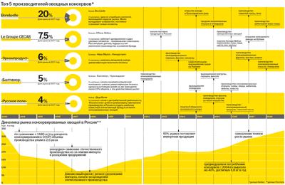 В то же время, крупные "консерваторы" утихомириваться не собираются. Нынешний лидер — Bonduelle — планирует в этом году увеличить выпуск на 20%, до 120 млн банок в год; его конкурент, французская Le Groupe CECAB, в сентябре прошлого года запустила завод мощностью до 80 млн банок. "Эрконпродукт" реконструирует производство и вложит в модернизацию около $10 млн.