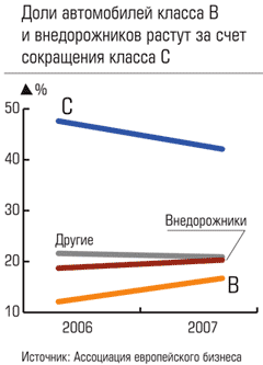 Анализ российского автомобильного рынка показывает, что он тоже не стоит на месте. За последние два года россияне заметно переориентировались на автомобили меньшего размера, но вместе с тем перешли в новую, более высокую ценовую категорию. Наиболее активными темпами сегодня развиваются сегменты B-класса и - традиционно - внедорожники. Несмотря на то что седаны C- и B-класса по-прежнему занимают лидирующие позиции, аналитики отмечают явный спад интереса к С-классу. В качестве одной из причин указывается то, что B-класс более компактен и удобен для использования в растущих российских мегаполисах.