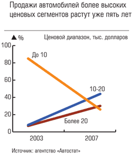 Как отмечает руководитель группы по предоставлению услуг компаниям автомобильной отрасли партнер PricewaterhouseCoopers Стэнли Рут, заметно возросла доля расходов на автомобиль в располагаемых доходах населения. Если в 2006 году эта доля составляла 4,38% от располагаемых доходов, то в 2007 году она выросла до 5,15%. Поэтому достаточно динамично растет и средняя цена, которую покупатель рассматривает как приемлемую для покупки автомобиля. Некоторые эксперты считают, что уже в 2008?2009 годах средняя цена автомобиля поднимется до 25?30 тыс. долларов, что соответствует среднему европейскому уровню. Российские покупатели ищут свой баланс функциональности, имиджа и цены автомобиля.