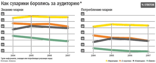 "Коммуникационный стержень должен попадать в самую важную зону",— не сомневается Дмитрий Васильев. Он уверен, что сегодня любая маркетинговая ошибка может дорого обойтись компании, поэтому брэнд обязан соотноситься с потребителем на 100%. "Золотое время для сухариков в России, 2001-2005 годы, прошло,— ударяется в воспоминания Васильев.— Особенно в 2002-2003 годах не было серьезных трудностей: рост бизнеса измерялся трехзначными цифрами! Мы спокойно себе строили производственные площадки, пробовали новые продукты — ну не пошел, и ладно, попробуем новый. Сейчас цена ошибки очень велика".