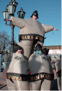 прохожих в недоумение шокирующими и смешными выходками. «Сумоисты» то оживленно
