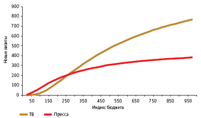 маленьких бюджетах пресса работает лучше, чем ТВ (график «Отклик для имиджевой