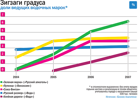 Тем не менее оборот компании за прошлый год оценивается в 11,8 млрд руб., а ее единственный водочный брэнд "Путинка", по данным "Бизнес Аналитики", в 2007 году занимал второе место на российском рынке с долей 4,3% (см. график). Для "выскочек" очень даже неплохо. Марке предрекали скорую кончину после президентских выборов, но не тут-то было: президент поменялся, а продажи не падают.