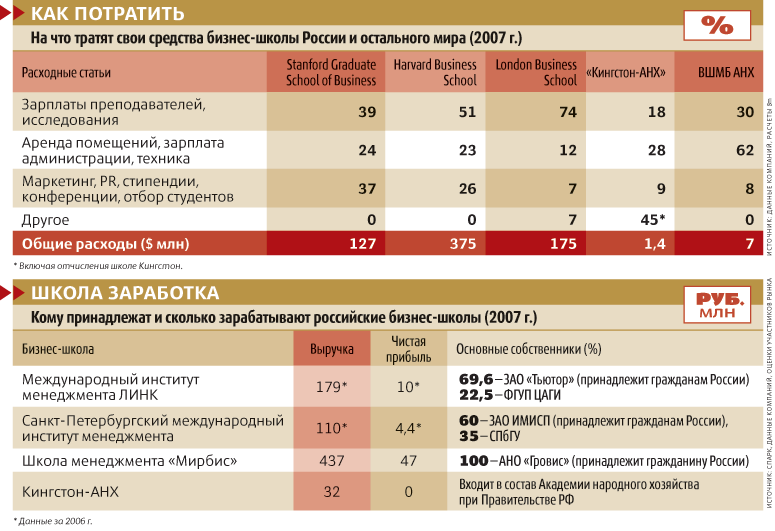 Российские заведения, впрочем, экономят по-своему. Даже те, у кого среди собственников есть частные лица международный институт менеджмента ЛИНК, Санкт-Петербургский международный институт менеджмента, имеют в соучредителях образовательные госструктуры и могут дешево привлекать их преподавателей. Но до доходов, например, частного «Мирбиса» им далеко. Впрочем, у того партнером выступает «Уралсиб» (сейчас корпорация ведет переговоры о покупке «Мирбиса»): без спонсоров в бизнес-образовании и правда далеко не уедешь.