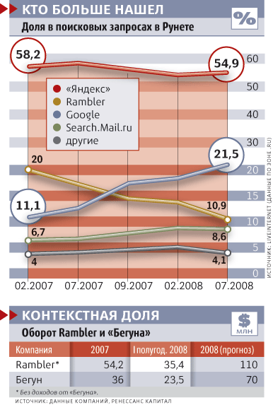 Купив «Бегун» и заключив партнерство с Rambler, Google убивает двух зайцев сразу. «Бегун» второй по величине (после «Яндекса») игрок на отечественном рынке контекстной рекламы с долей 20,2%. А установив собственный поисковик на главной странице Rambler, Google зачислит в свой актив те запросы его посетителей, которые прежде шли через собственный поисковый сервис Rambler. Сейчас на долю последнего приходится примерно 10% поисковых запросов русскоязычных пользователей. Таким образом, Google может рассчитывать на то, что ей удастся вплотную приблизиться к «Яндексу» по популярности.