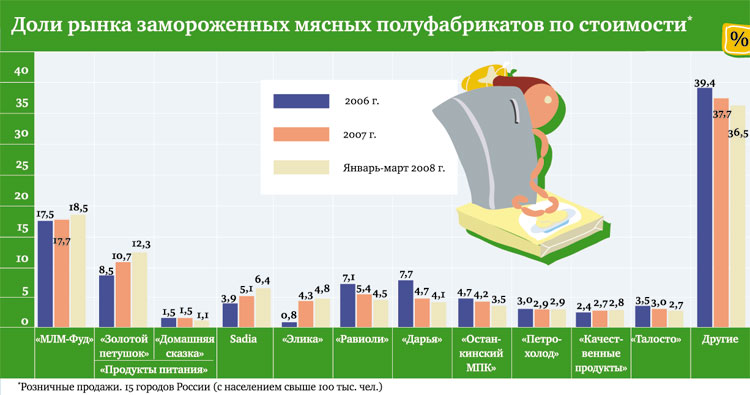 ИК «Бизнес-Аналитика» оценивает стоимостную долю рынка «Продуктов питания» в 13,4 процента (данные за январь-март 2008 года, розничные продажи). Это второе место в рейтинге производителей замороженных мясных полуфабрикатов. Первое занимает «МЛМ-Фуд» (18,5 процента). При этом эксперты отмечают позитивную динамику компании: с 2006 по 2007 год её показатели выросли на 2 процента (см. рисунок).