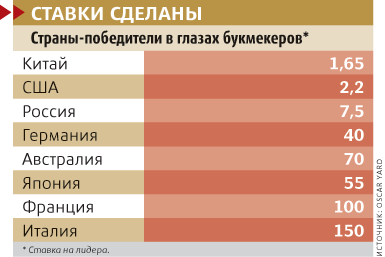 Oscar Yard пока принимает ставки только на то, какая страна сколько медалей завоюет. «Есть три безусловных лидера: Китай, США и Россия. Причем мы считаем, что именно Китай выиграет, ведь китайские спортсмены у себя дома», рассказывает Журавский. На страну-чемпиона по числу медалей Oscar Yard, присутствующая в 19 европейских столицах, а также в Нью-Йорке и Лас-Вегасе, приняла ставок примерно на $470 000. Из них от россиян поступило $40 000. Неплохо, но все же не так здорово, как было с футболом. Только на одном матче Россия-Швеция на Евро-2008 Oscar Yard собрала $3,1 млн. Впрочем, время до начала соревнований еще осталось, ставок обязательно будет больше.