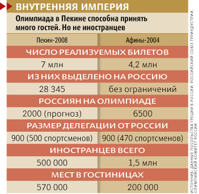 По его словам, афинская Олимпиада 2004 г. «отбросила национальный турбизнес на несколько лет назад». Всего за три квартала 2003 г. Греция приняла более 150 000 российских туристов, а за весь олимпийский год эту страну посетило лишь 100 000 россиян, причем непосредственно на Игры поехало всего 6500 из них. «Стоимость турпродуктов перед Олимпиадой выросла в 2-2,5 раза, причем не только в Афинах, но и по всем основным курортам», вспоминает гендиректор «Магазина горящих путевок» Сергей Агафонов. По его оценкам, необоснованное увеличение цен привело к оттоку российских туристов на другие греческие направления на 40-60%. Как бы такого не случилось и с Китаем.